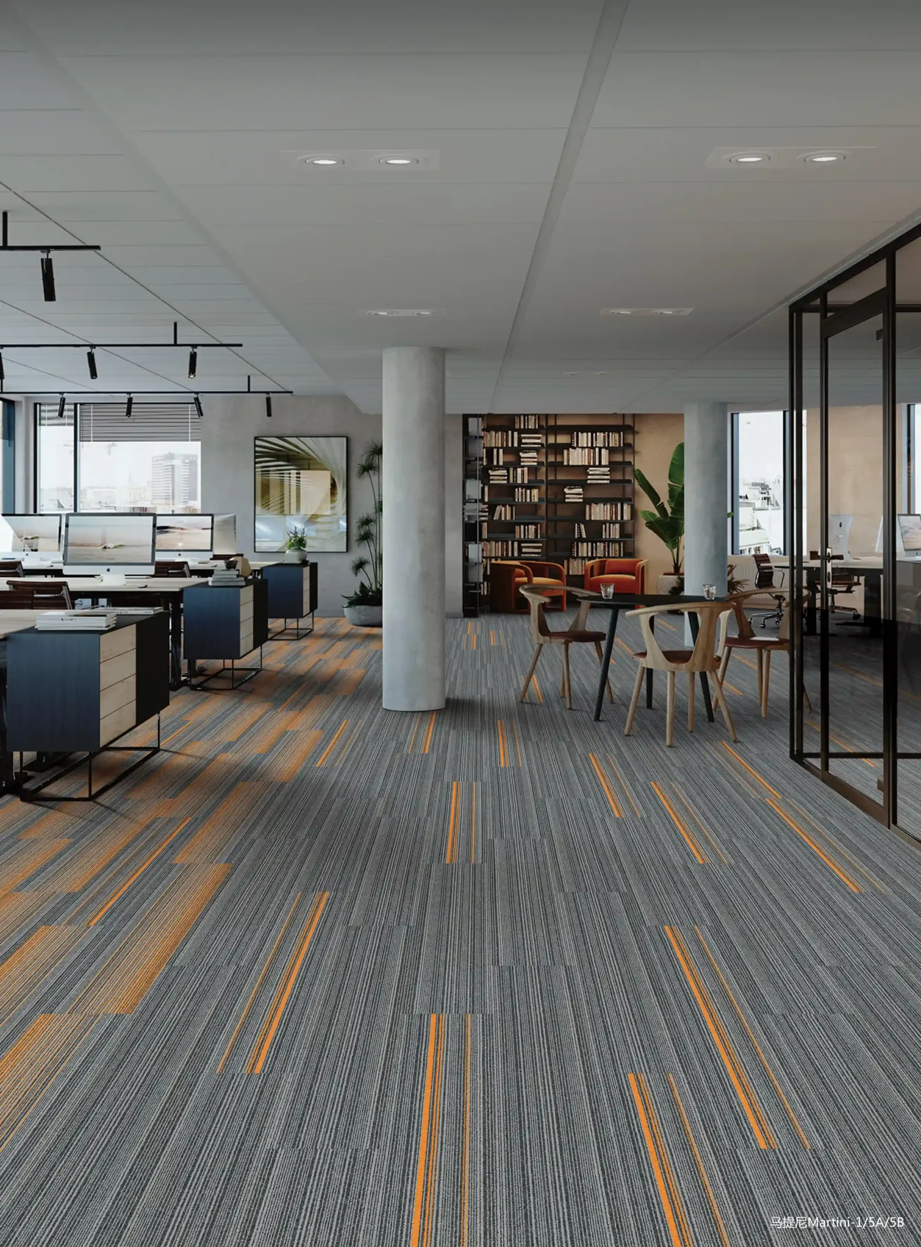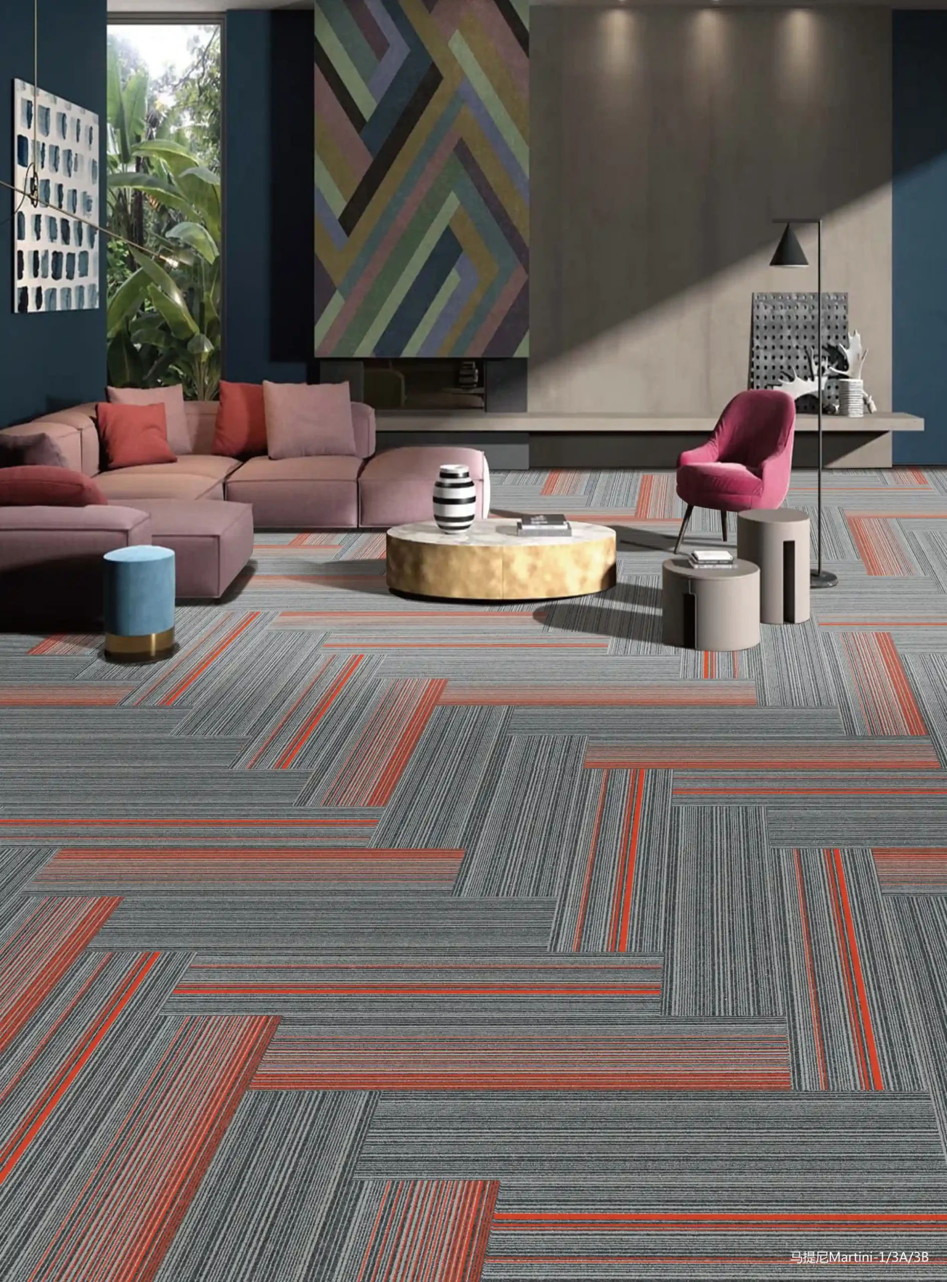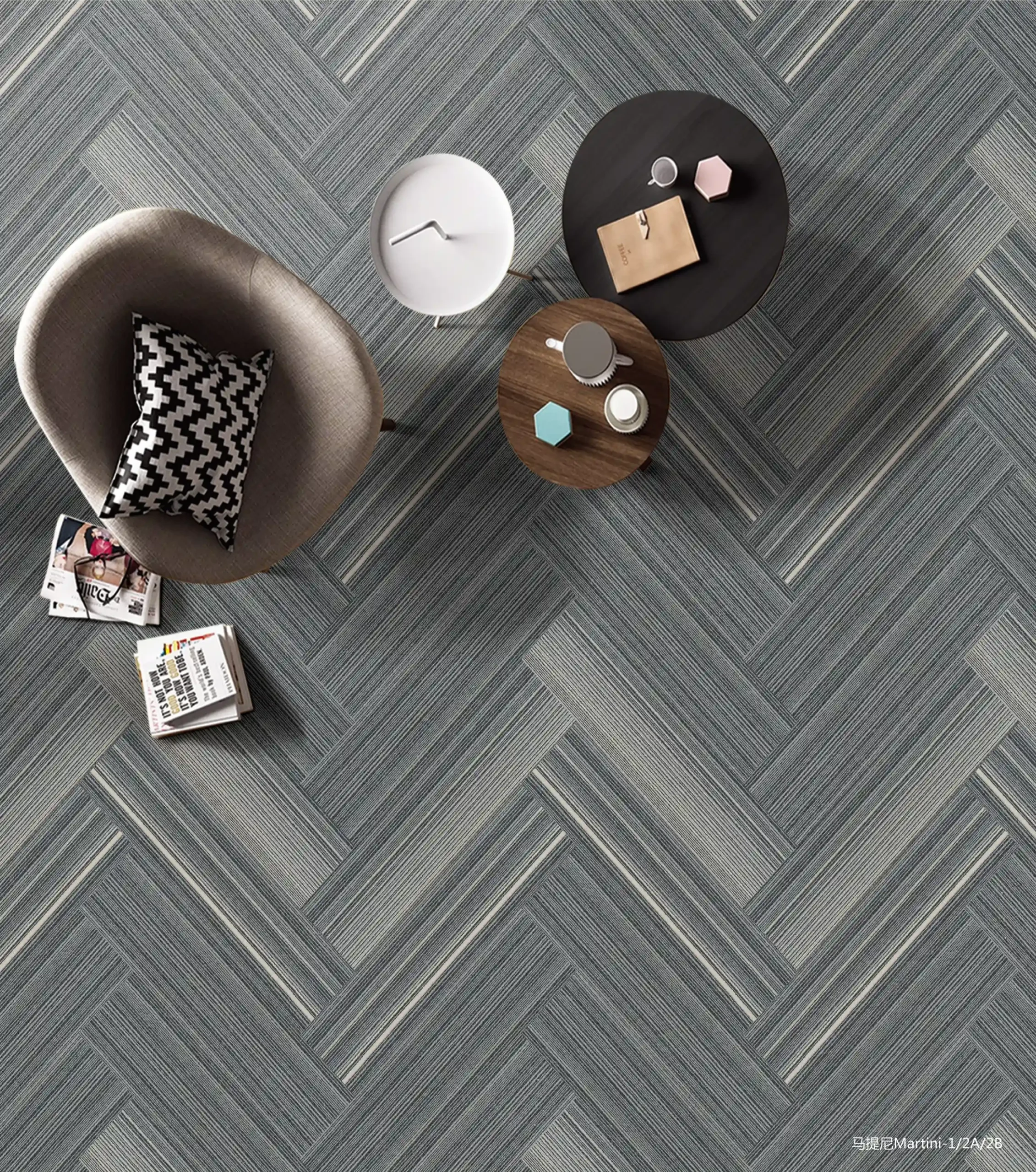 The Martini Series Carpet Tiles offer a premium flooring solution with modern style, high durability, and design flexibility. Made with 100% polypropylene (PP) face yarn and a strong PVC backing, these tiles are built for long-lasting performance in commercial and residential spaces. Each tile measures 250 × 1000 mm (9.84 × 39.37 inches) and can be installed in multiple layout patterns such as Monolithic, Ashlar, Brick, Stagger, and Herringbone, allowing you to create visually dynamic interiors.
