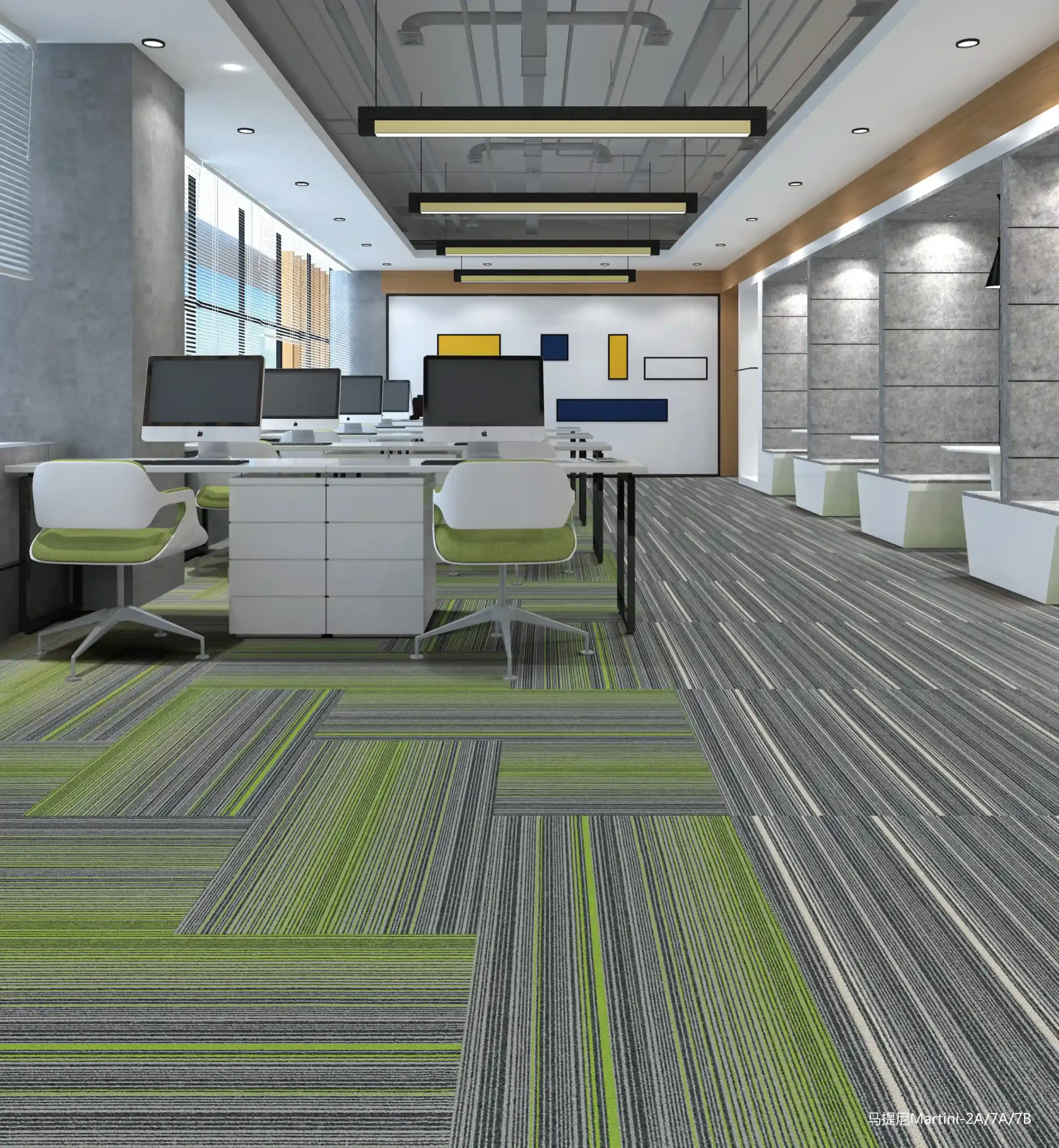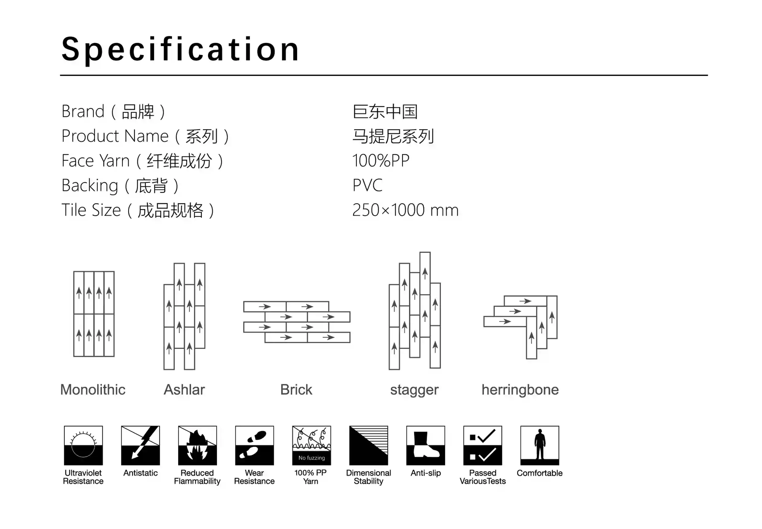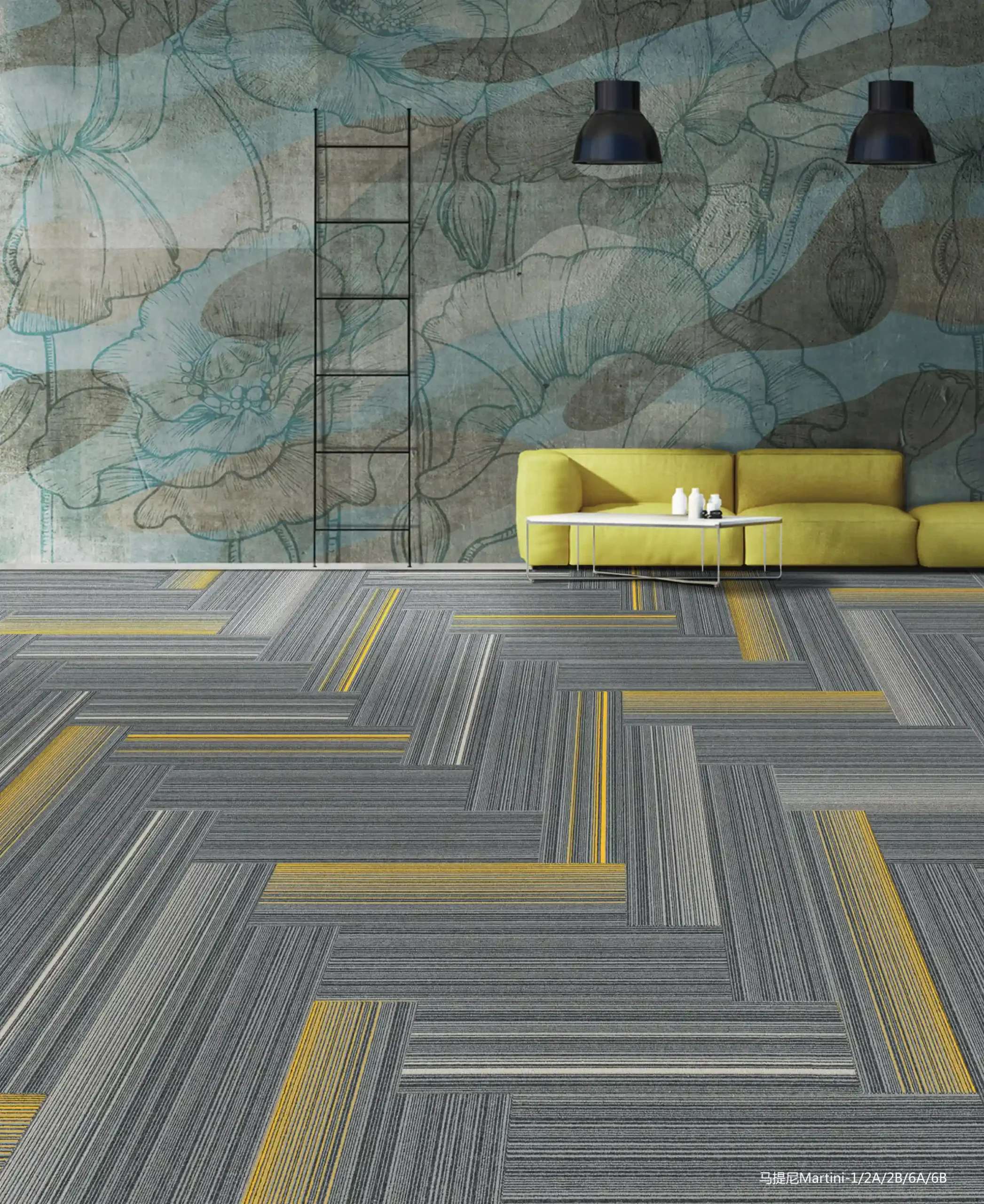 The Martini Series Carpet Tiles offer a premium flooring solution with modern style, high durability, and design flexibility. Made with 100% polypropylene (PP) face yarn and a strong PVC backing, these tiles are built for long-lasting performance in commercial and residential spaces. Each tile measures 250 × 1000 mm (9.84 × 39.37 inches) and can be installed in multiple layout patterns such as Monolithic, Ashlar, Brick, Stagger, and Herringbone, allowing you to create visually dynamic interiors.