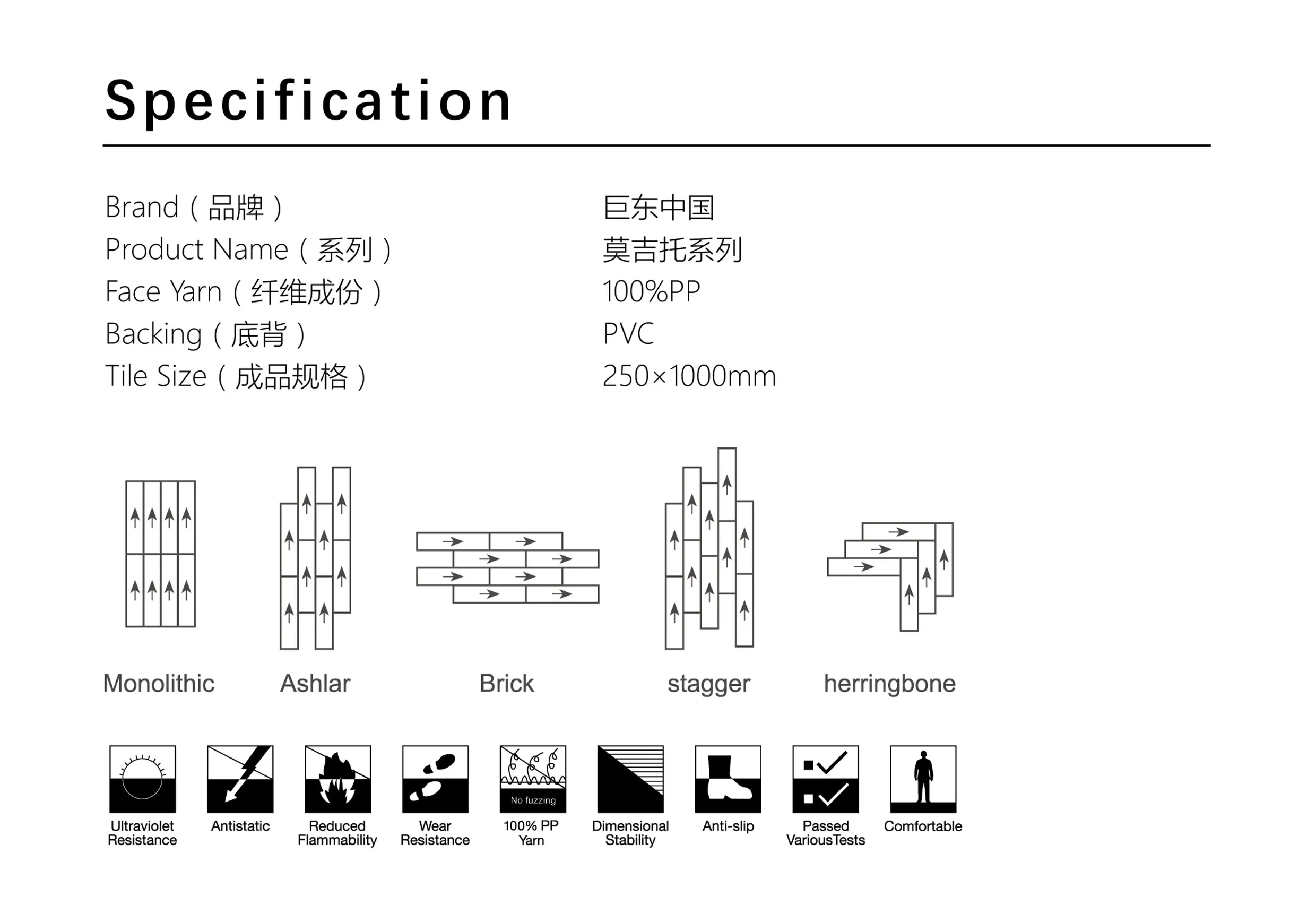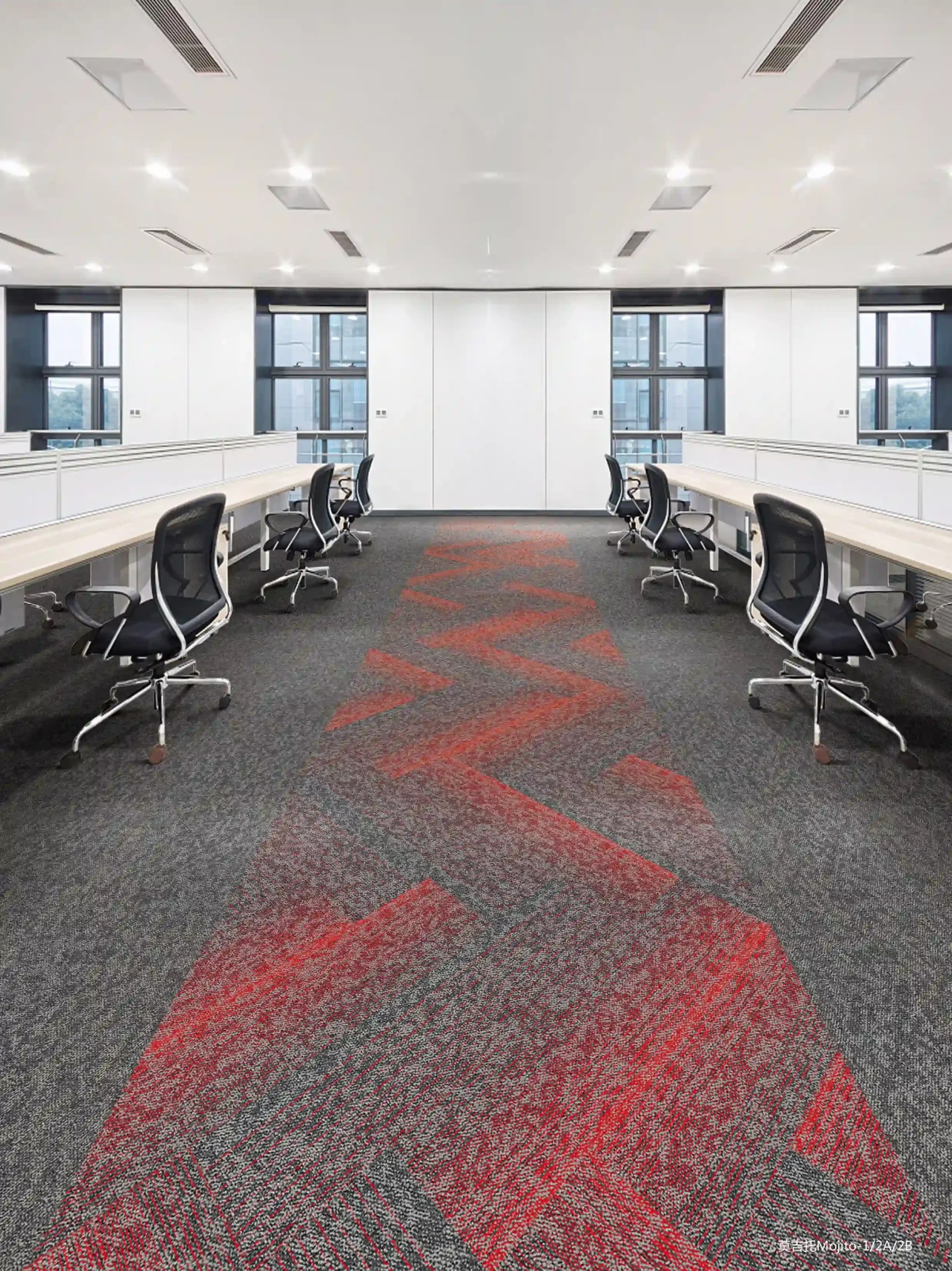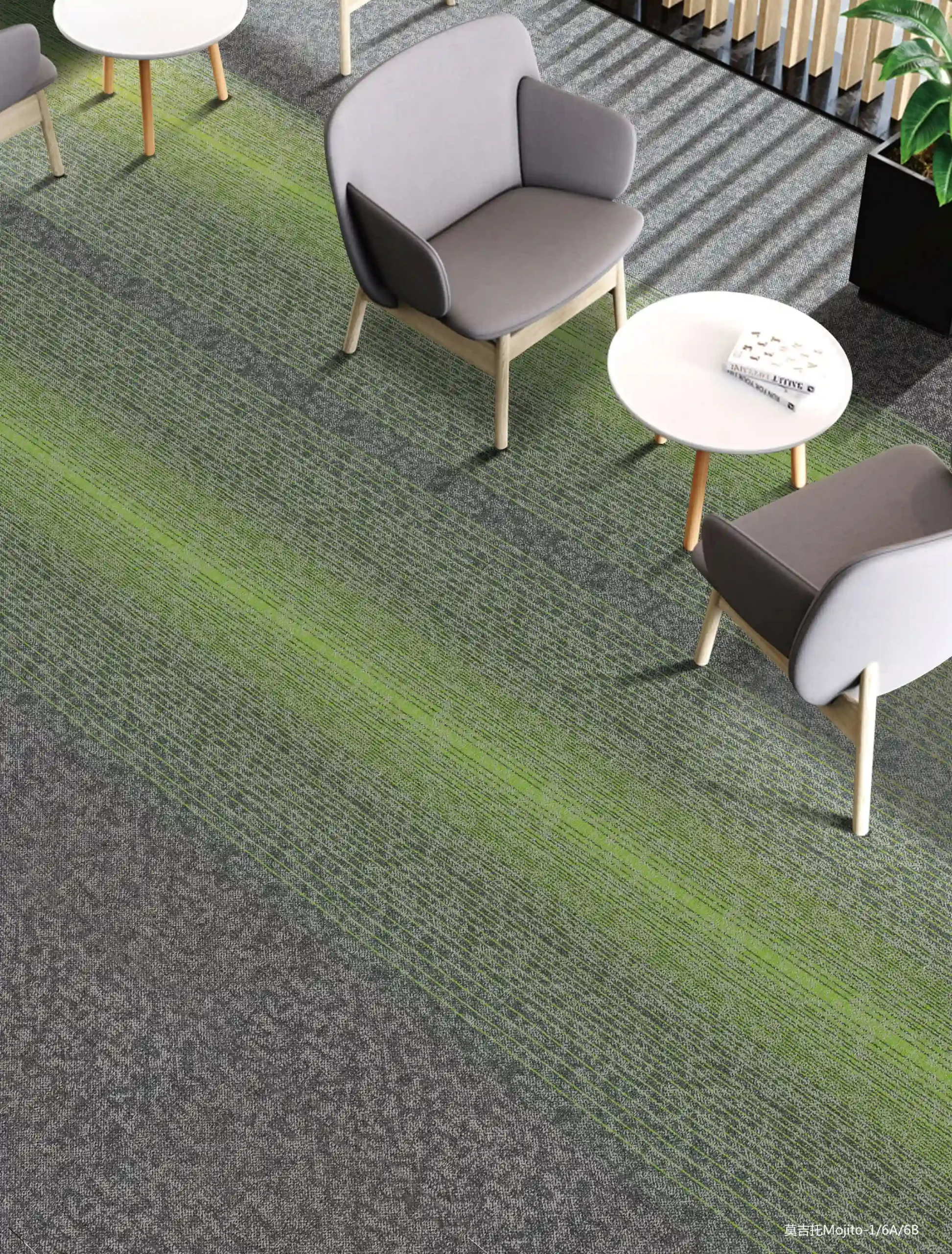 Our Mojito Series Carpet Tiles offer a stylish, durable, and customizable flooring solution for commercial and residential spaces. Made with 100% PP (Polypropylene) yarn and a PVC backing, these tiles ensure long-lasting performance with excellent dimensional stability. Each tile measures 9.84 inches × 39.37 inches, allowing multiple installation patterns such as Monolithic, Ashlar, Brick, Stagger, and Herringbone for a unique design finish.